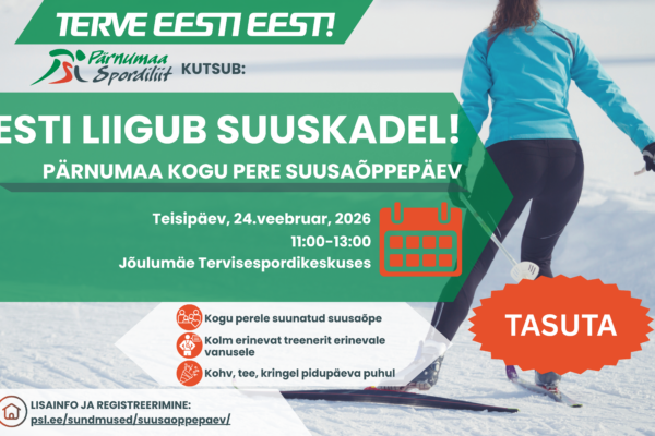 16. veebr. 2026 Lisas: Pärnumaa Spordiliit Pärnumaa liigub Kommentaarid puuduvadAeg ja koht: 24. veebruar 2026 11:00–13:00 Jõulumäe Tervisespordikeskus Eesmärk:Tähistame Eesti Vabariigi aastapäeva liikudes! Päeva eesmärk on pakkuda peredele võimalust veeta ühiselt aega värskes õhus , õppida suusatamise põhioskusi ning saada kindlus iseseisvalt rajale minna. Soovime näidata, et suusatamine on...